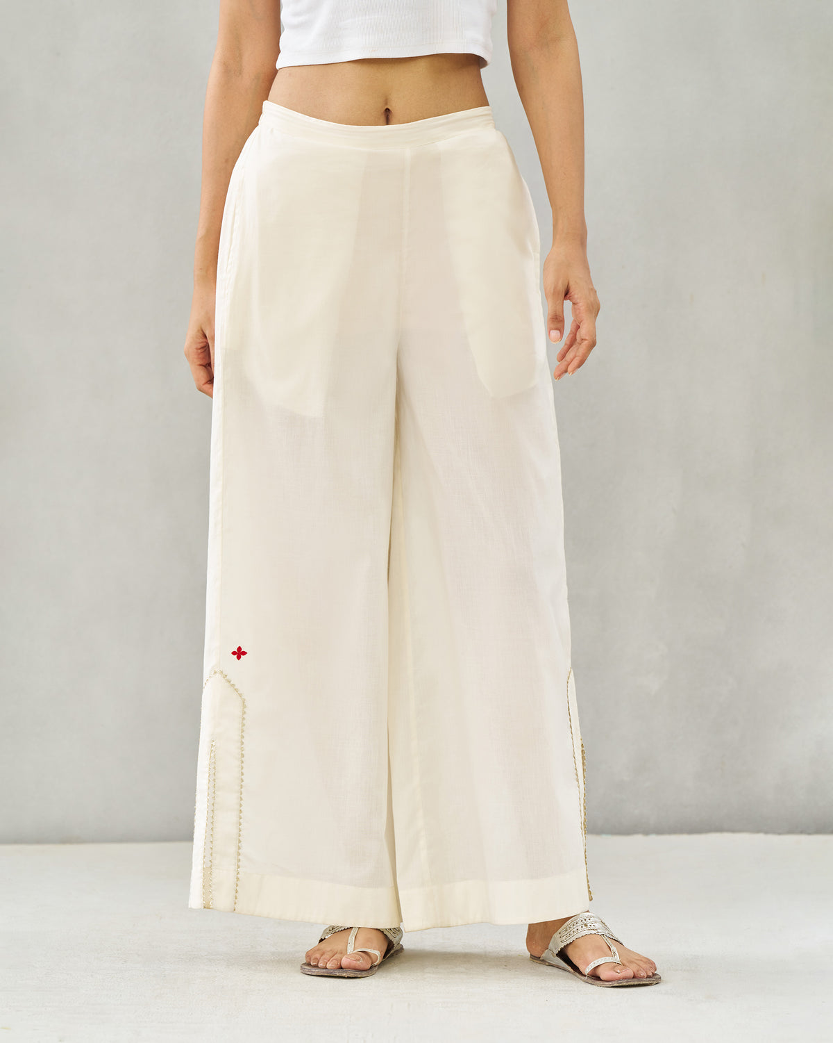 • The Ayat Pyjamas in ivory are the perfect pair for special occasions, in comfy cotton kora with silver gota detailing along the sides.