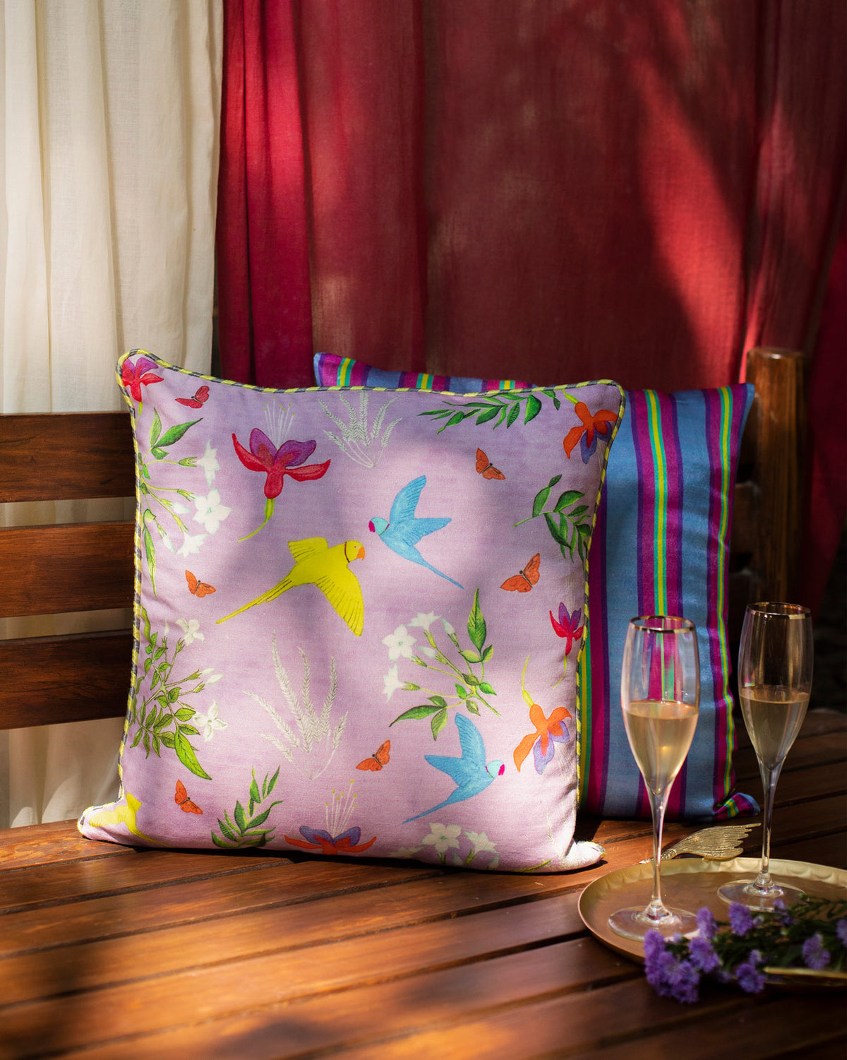 • Throw this satiny mashru cushion into the mix with its fun floral and tota print, and a contrasting stripe on the flip side