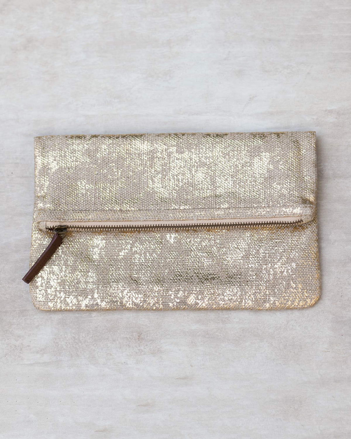 - Natural linen makes a cool gold-foil printed foldover clutch for both daytime and nighttime jaunts