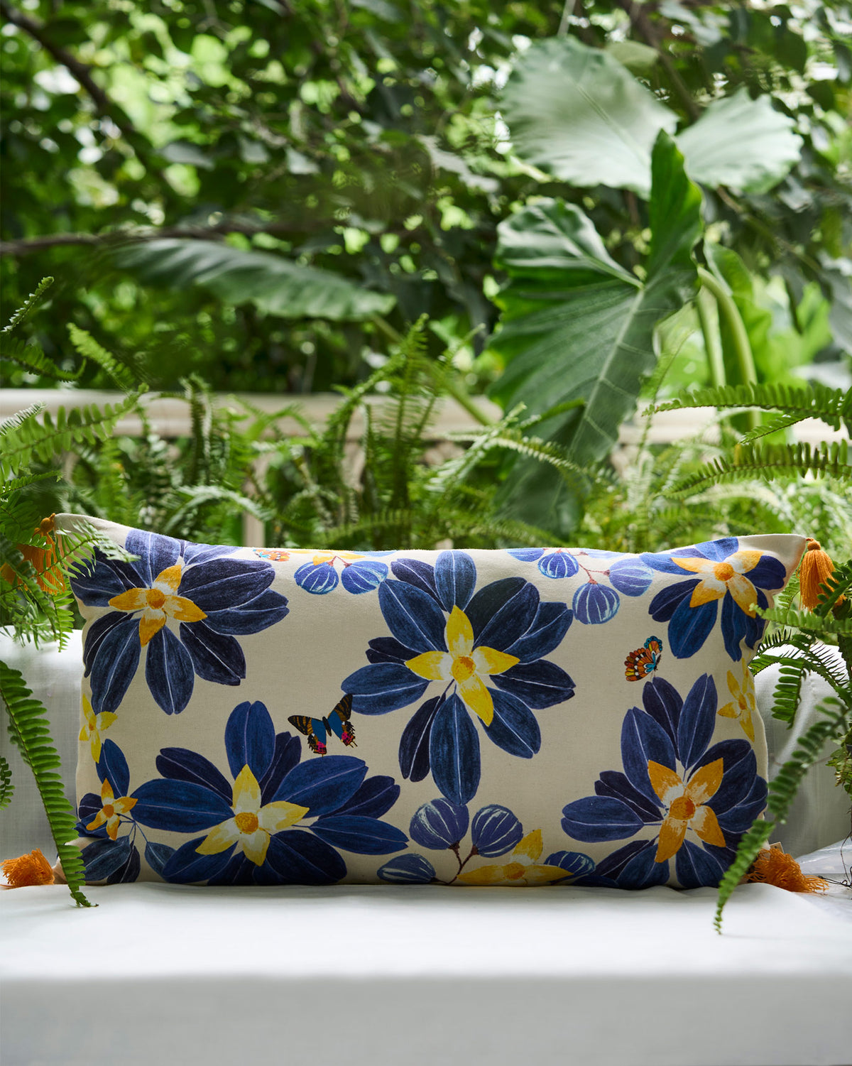 - Nicobar’s Bunga lumbar has a gorgeous floral print with dainty butterflies all over. It instantly elevates your everyday furniture.