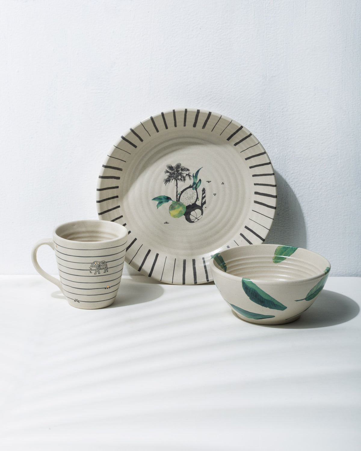 - Made from natural stoneware, and featuring beauitful botanicals and other isalnd motifs, this set is a keeper for many meals