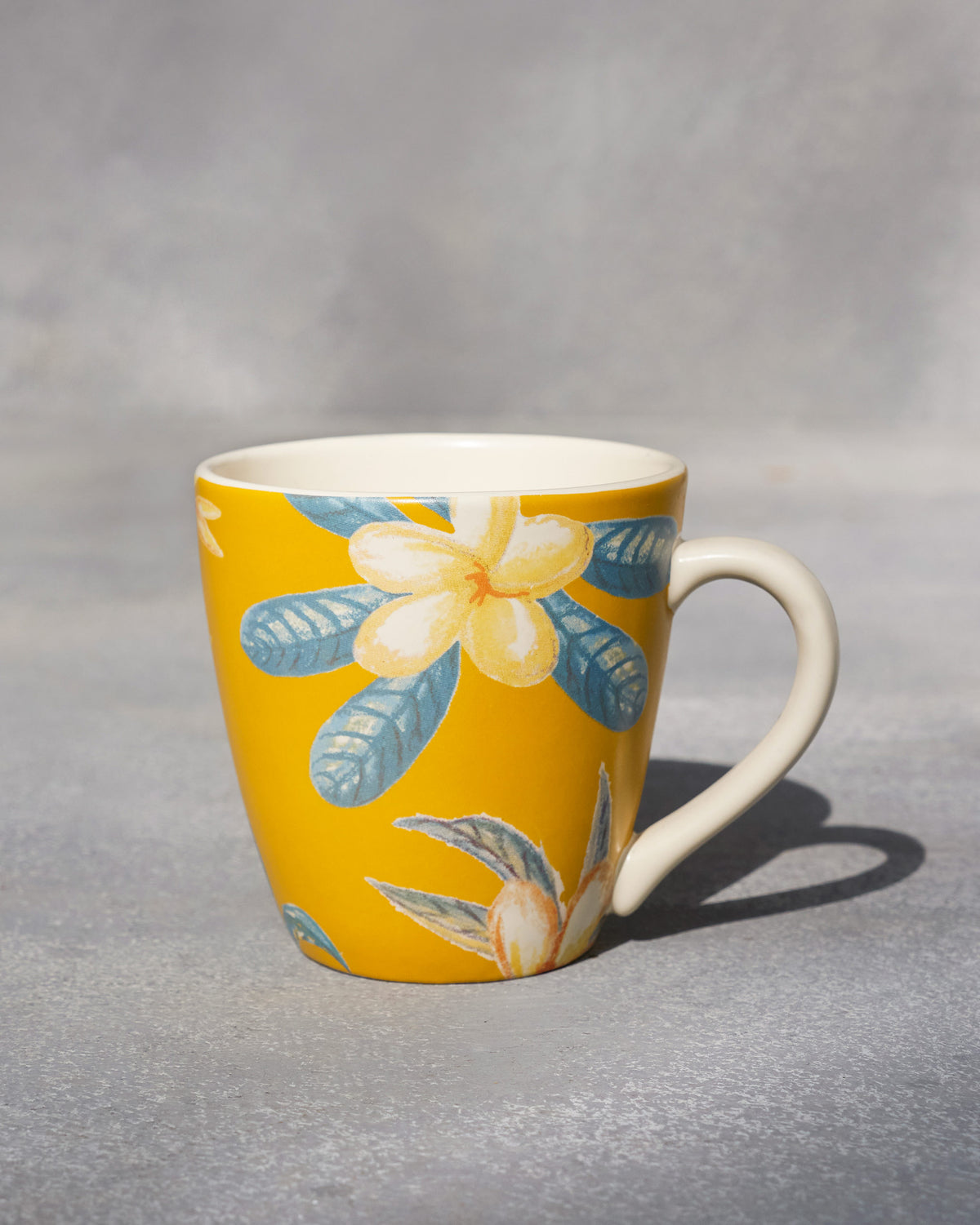 - With beautiful floral motifs printed on a base of ochre tone, this stoneware mug will prop up high tea with just the right infusion of colour and fun