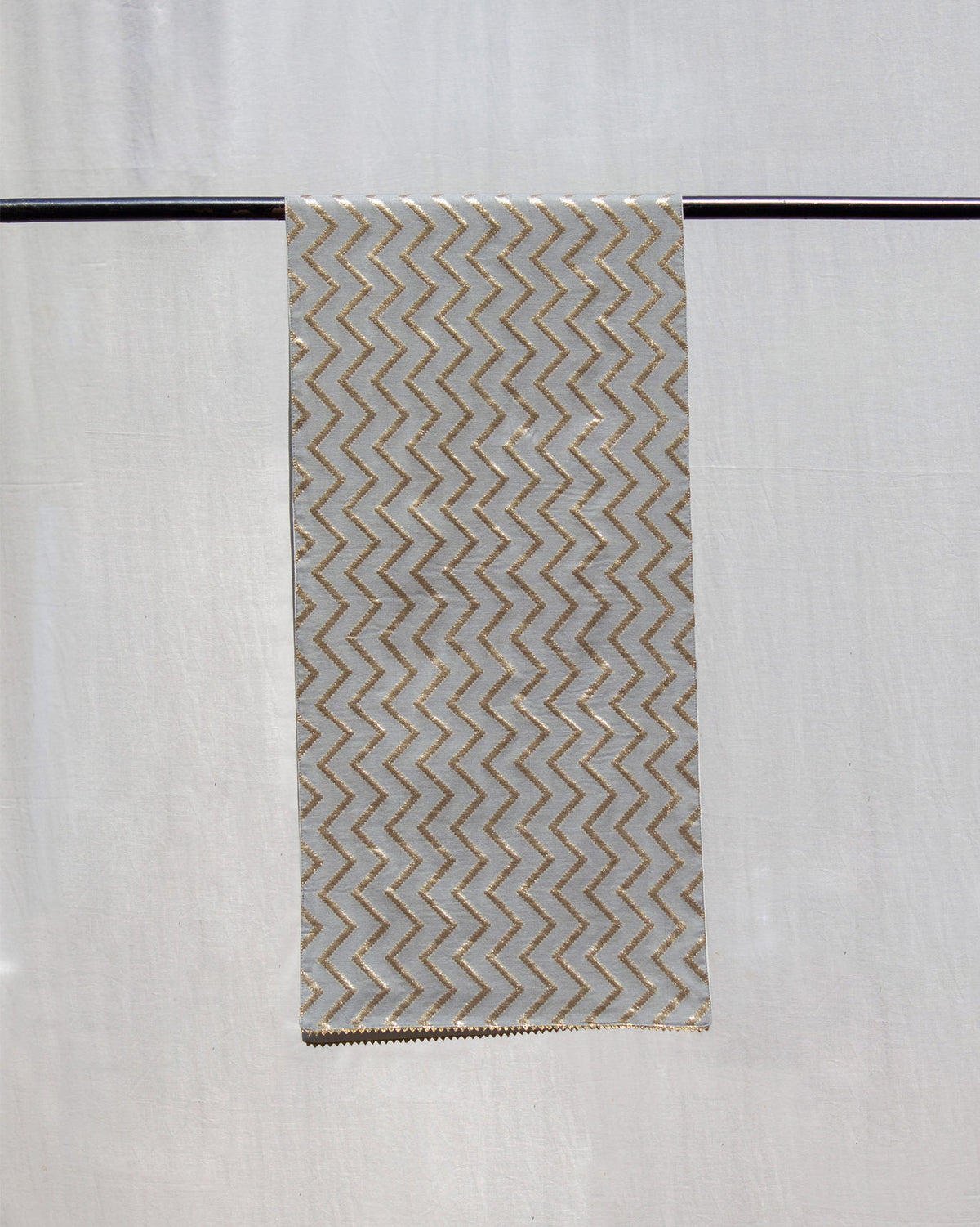 • Woven soft grey chanderi table runner with gold chervon detailing and silver triangular gota tapes running on two shorter edges