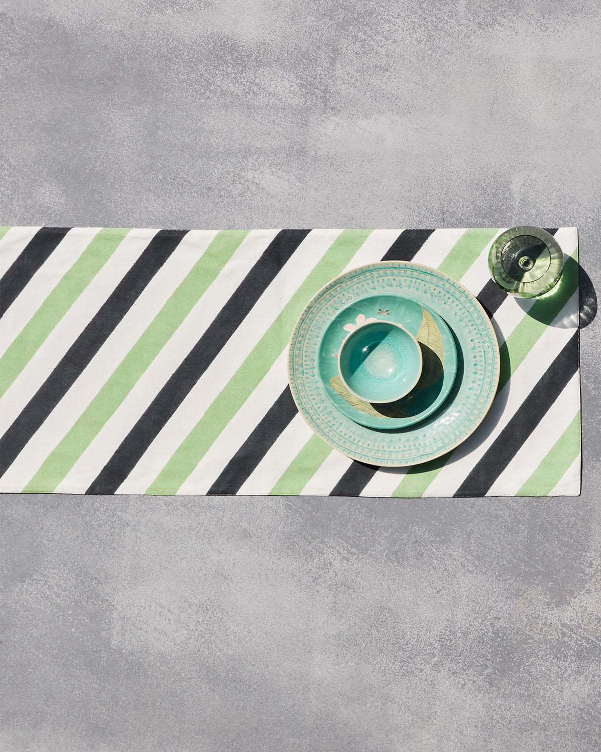 • In soothing tones of sage green and charcoal, this runner pairs effortlessly with any table setting.