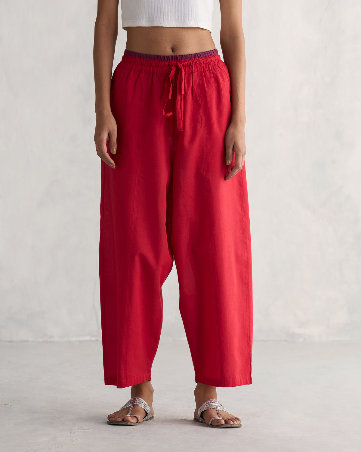 - The bold hue, blue selvedge detail and flared fit make the red Flayer Drawstring Pants a standout choice for those who appreciate style with a playful twist.