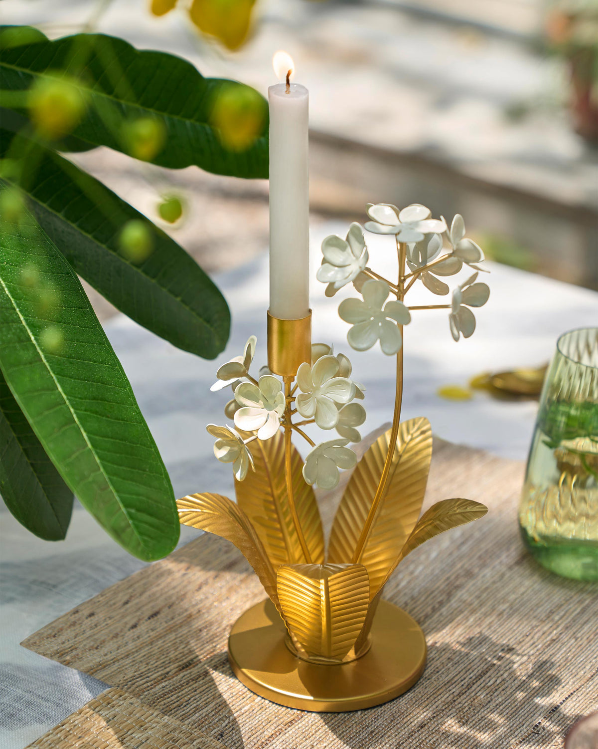 - Bring in a summer essence with this serene candle stand, featuring frangipani flowers and detailed leaves.