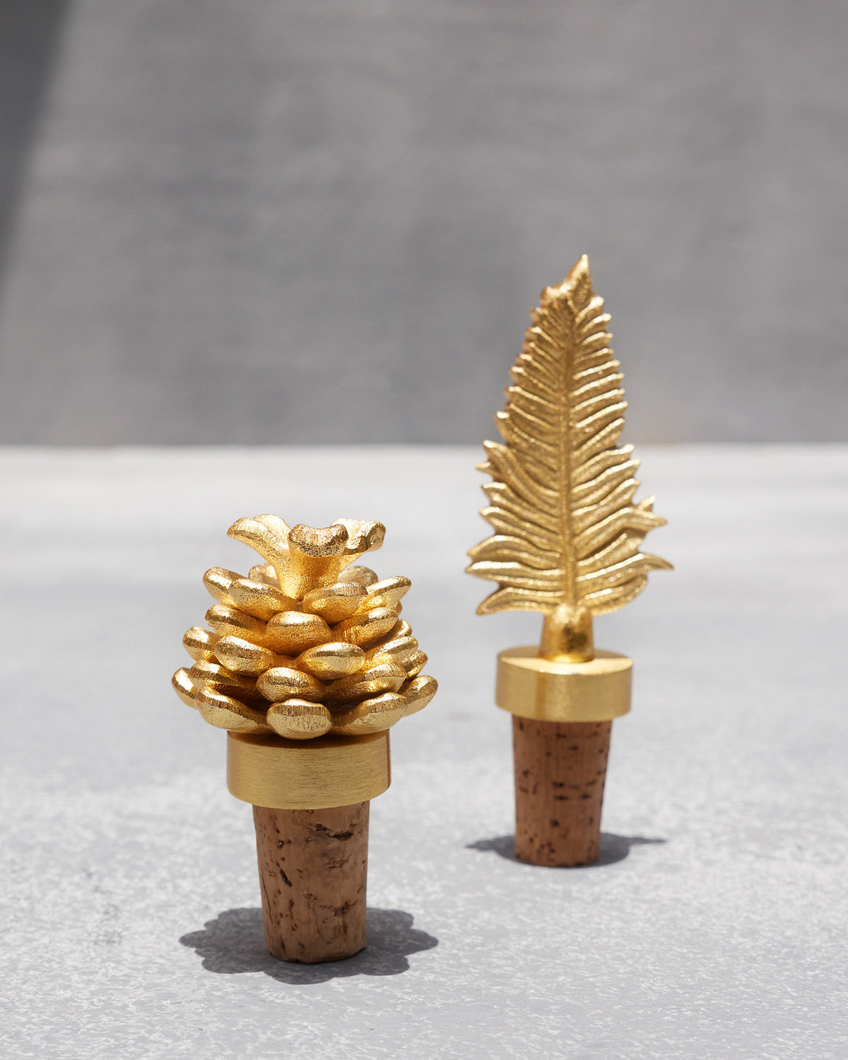 - A set of two: bottle stoppers in cork bottom and gold-finished aluminium