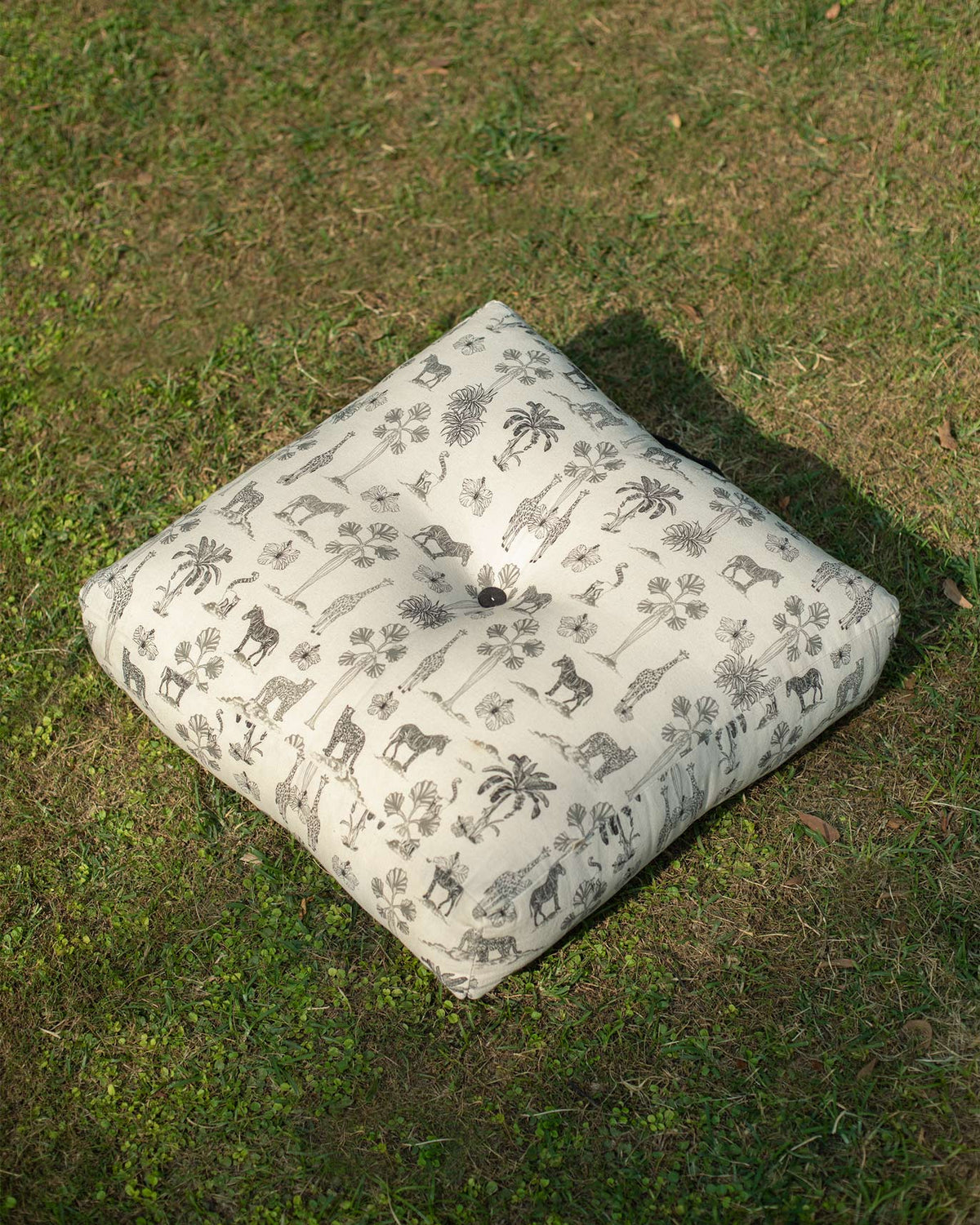 - A monochromatic floor cushion with motifs inspired by the flora & fauna found along India's Malabar coast