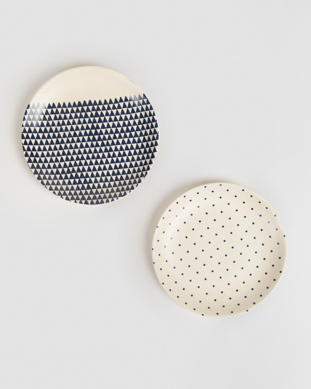 • A smooth stoneware base, geometric patterns, and a clean rim washes waves of deep blue over any meal
