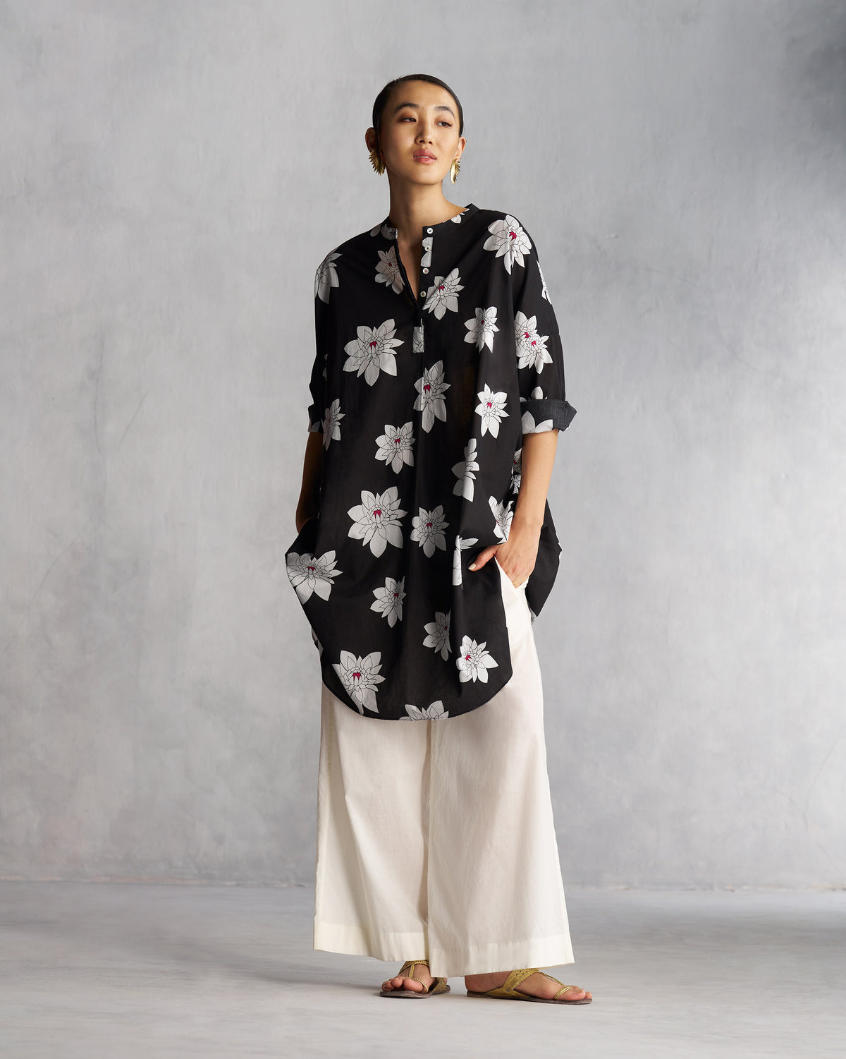 - Light, crisp and crafted beautifully in a loose fit our Lazy Sunday Tunic is a Nicobar favourite. This one comes in a black and white floral print.