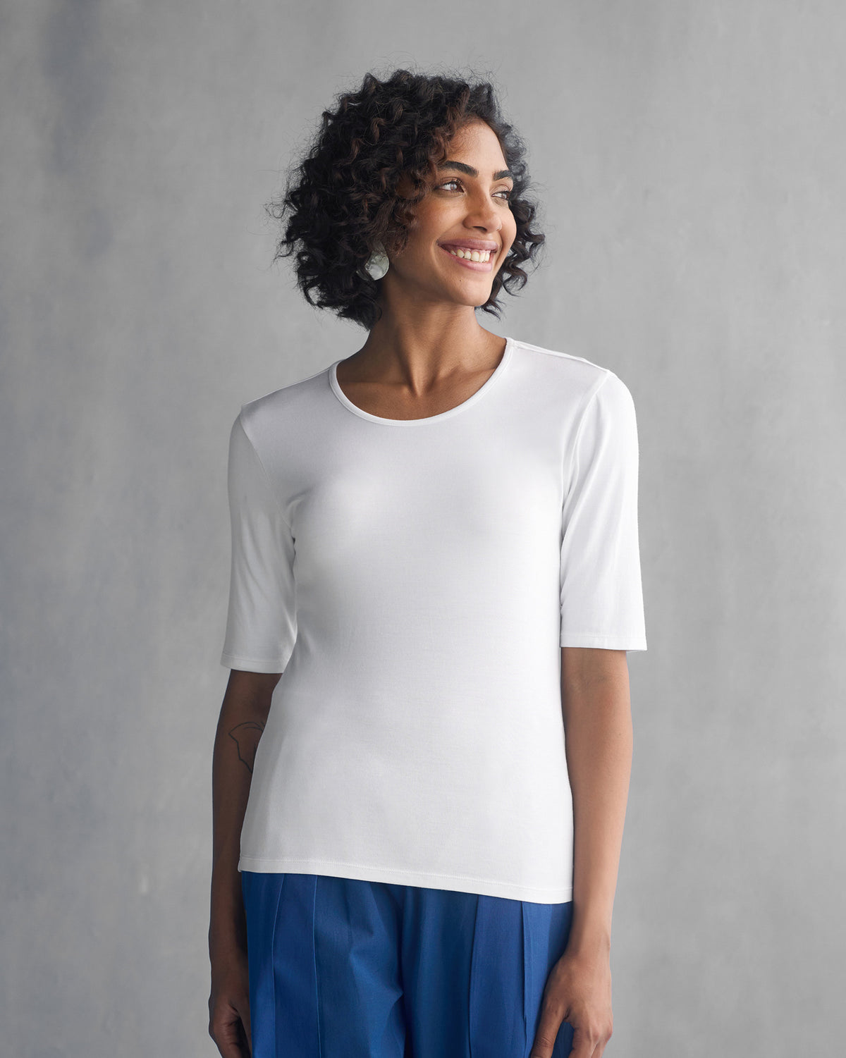 - A white jersey top crafted in viscose lycra with ochre color heart detail, perfect for summers