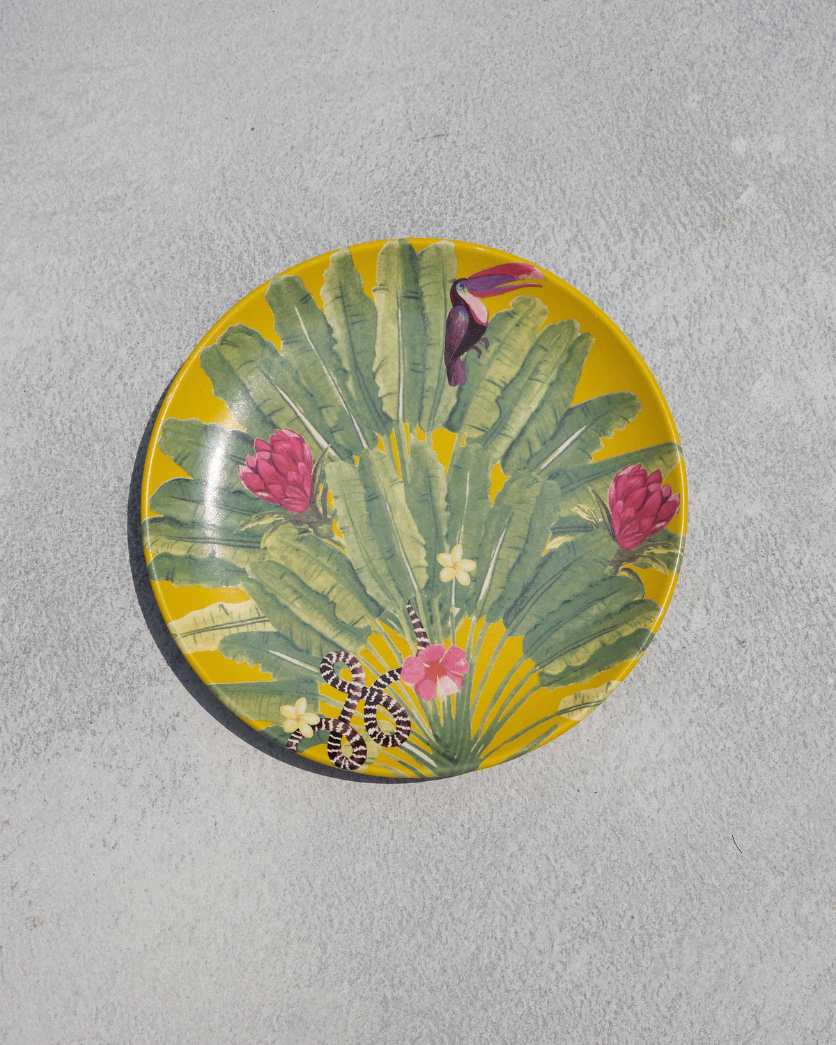 - Bring home the lively spirit of Zanzibar with the Madagascar Quarter Plate, featuring delightful motifs of a toucan and snake amidst lush leaves.