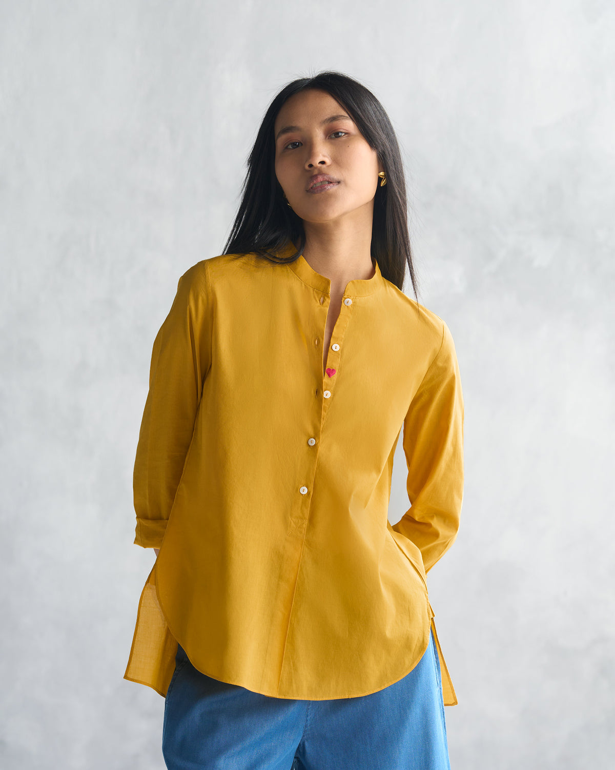 - The mandarin collar adds uniqueness to this wardrobe staple, while the embroidered heart on the placket adds a subtle yet playful detail. Don't miss the joyous parrot embroidery at the back!