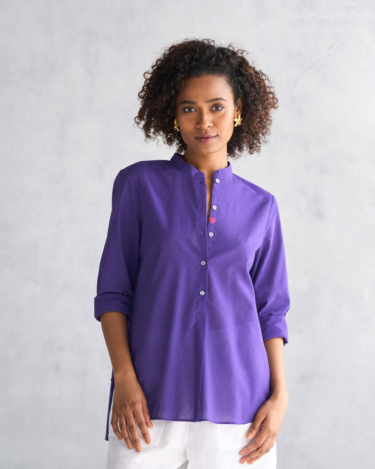 - The mandarin collar adds uniqueness to this wardrobe staple, while the embroidered heart on the placket adds a subtle yet playful detail. Don't miss the joyous parrot embroidery at the back!