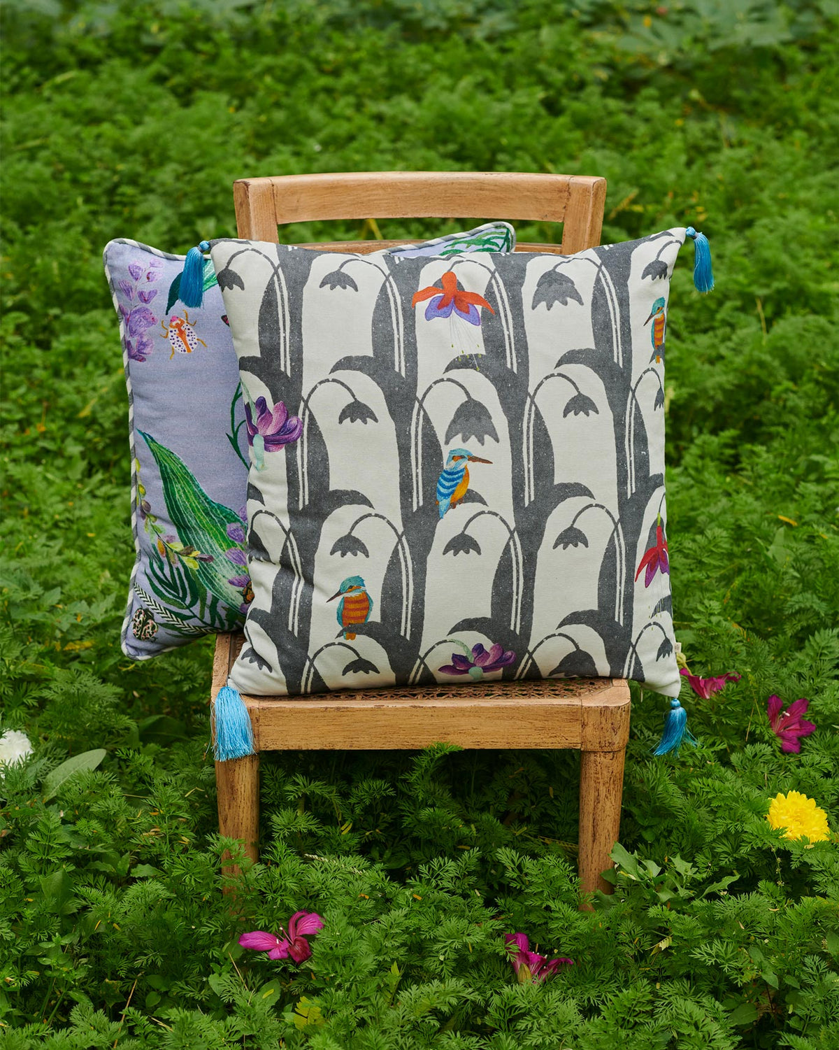 - Cushion featuring delicate Kashmiri blooms and vibrant kingfishers that celebrate Spring in the valley of Kashmir