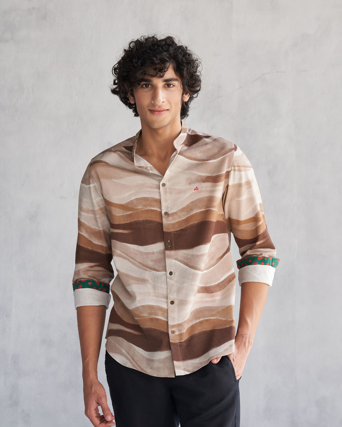- Embracing modern trends, the Nawab Shirt with a Nehru collar shirt pays homage to tradition while being extraordinarily comfortable and contemporary tradition. The rich brown hue and landscape print brings a contemporary edge.