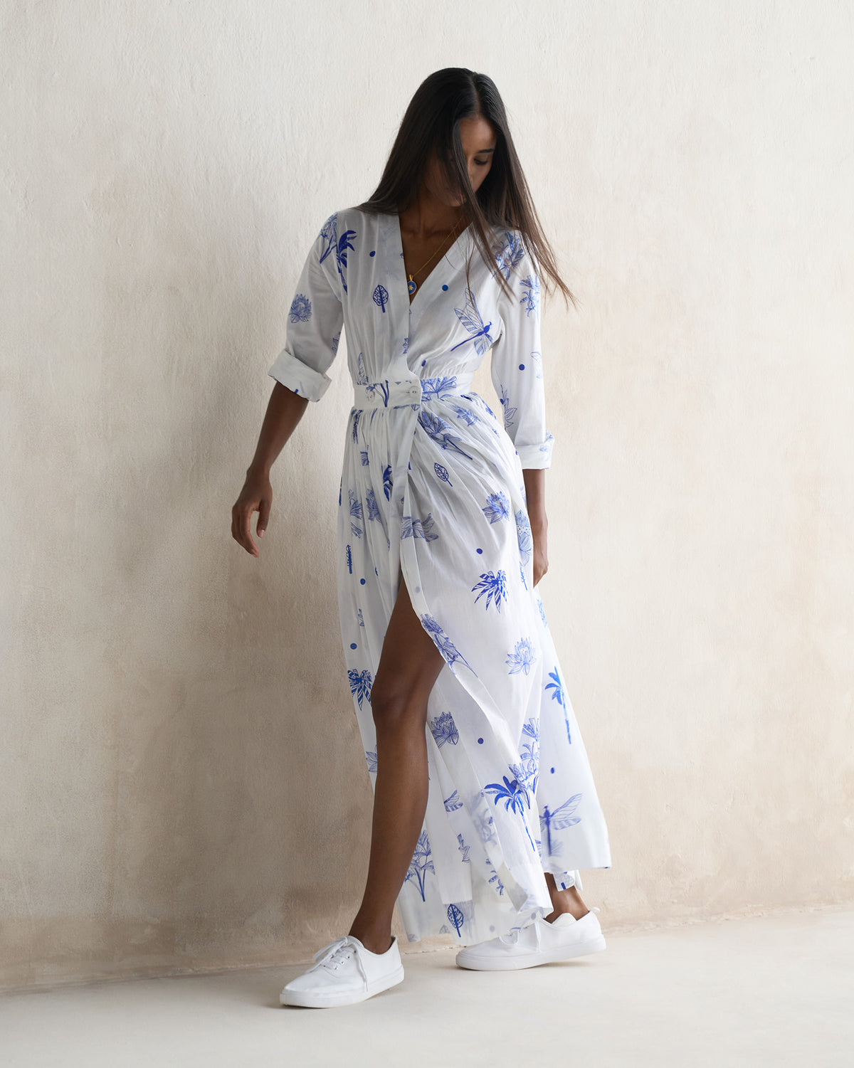- A style that's become our signature, this is an ankle-grazing wrap dress in a blue and white floral print, inspired from Bali.