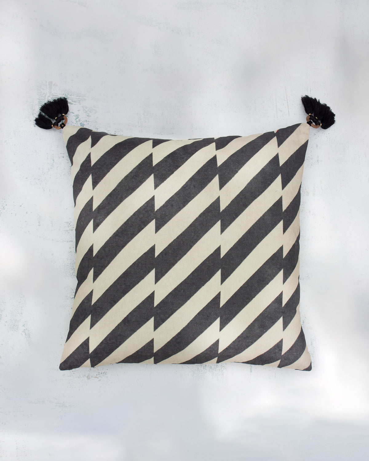 - A cushion cover that's printed on the front and back, with tassels on two adjacent corners