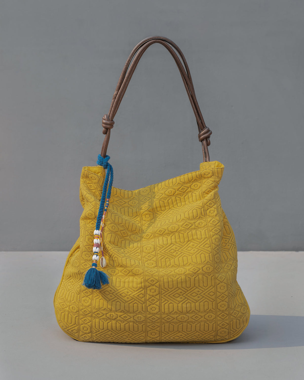 - A roomy tote in vibrant yellow jacquard with dark brown adjustable straps and detachable tassels