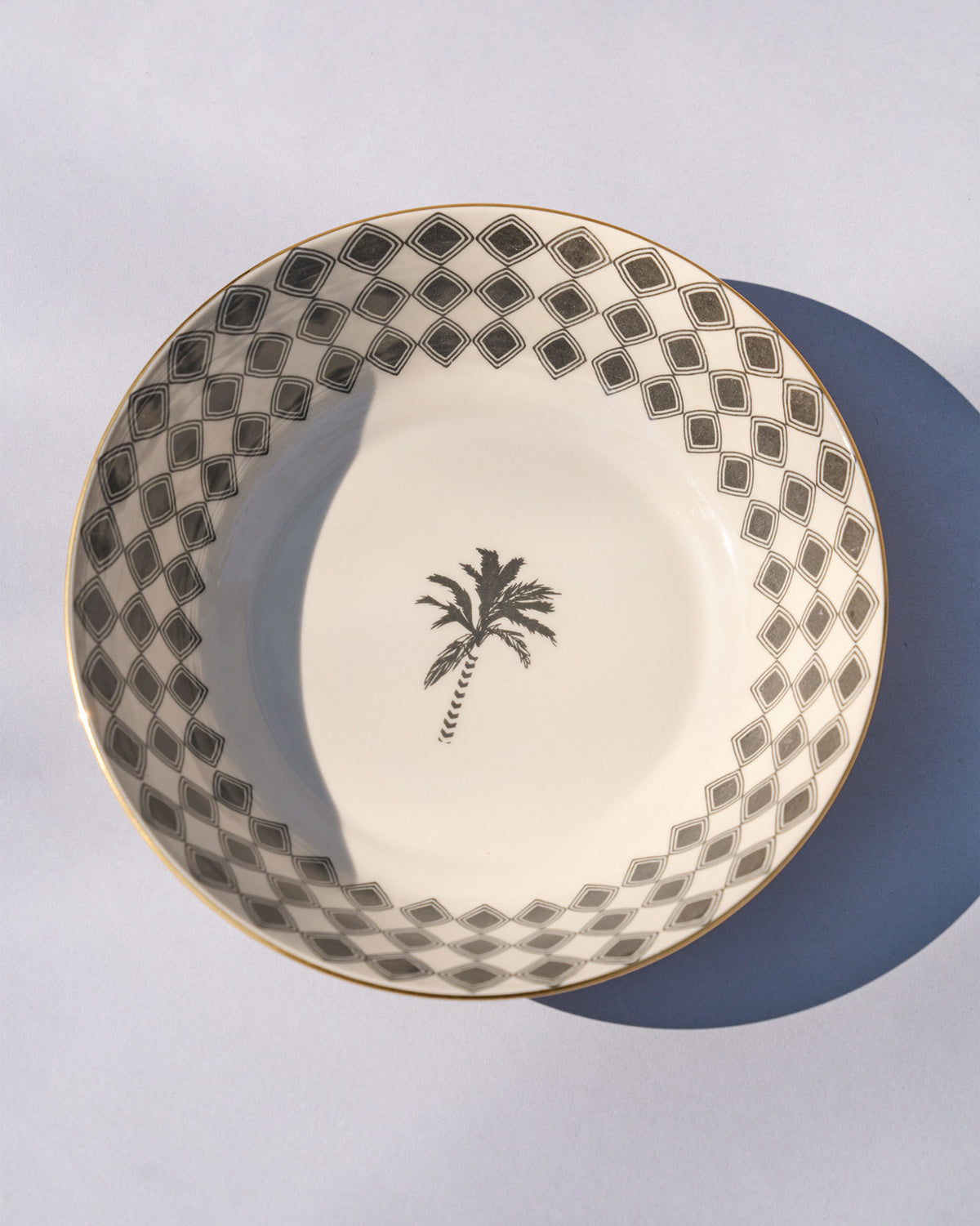 - A generously proportioned glazed bowl with graphic print in classic charcoal and ivory