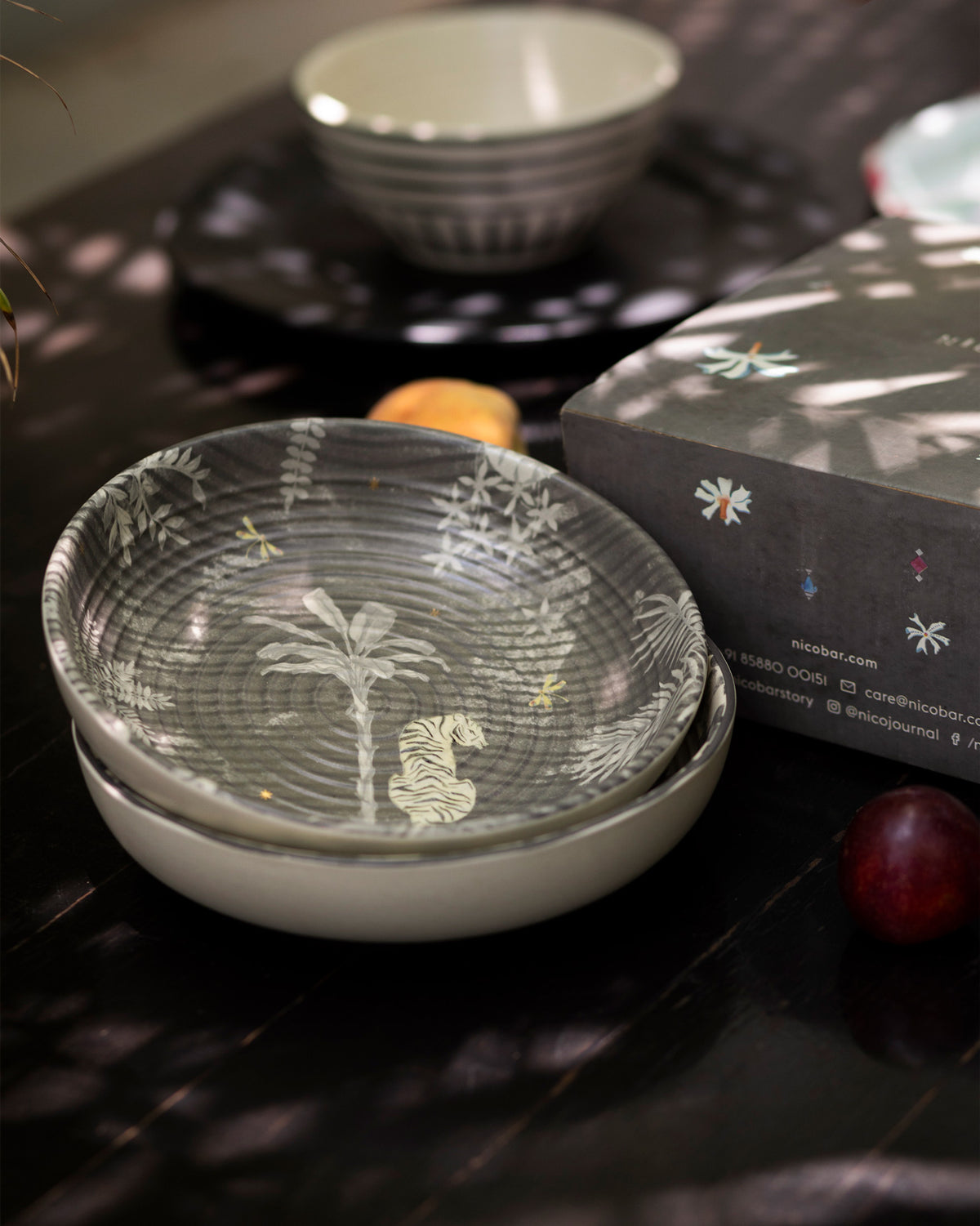 - Inspired by the romantic malabar coast, this shallow bowl is a dream in charcoal grey+gold