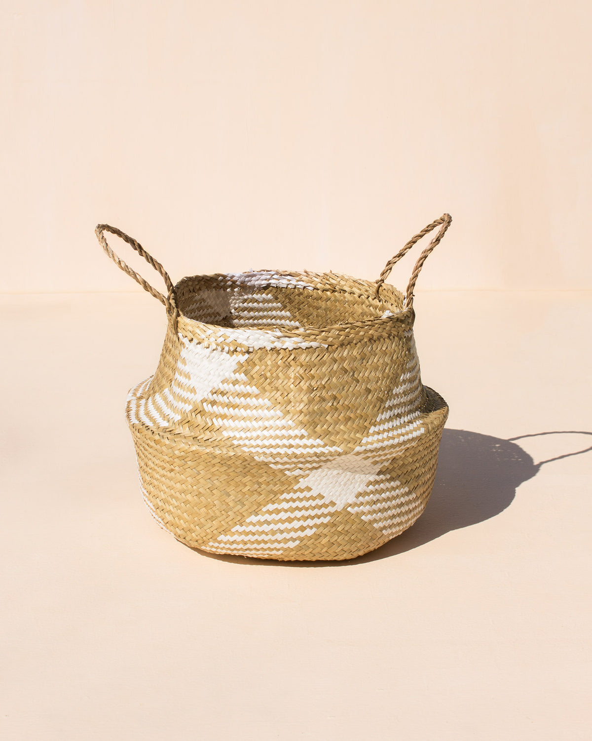 - Crafted in a natural fibre, the white pattern on this basket is insipred by the prints on the makeshift homes of the Banjara community