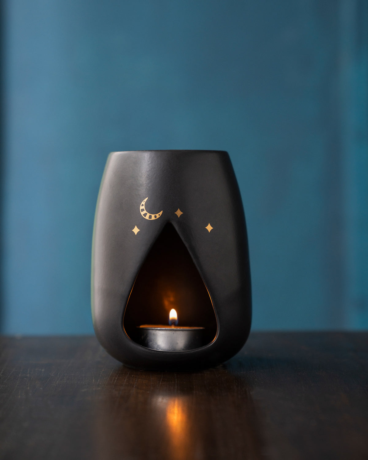 - A matte stoneware diffuser featuring mini caves to pop the tealights in