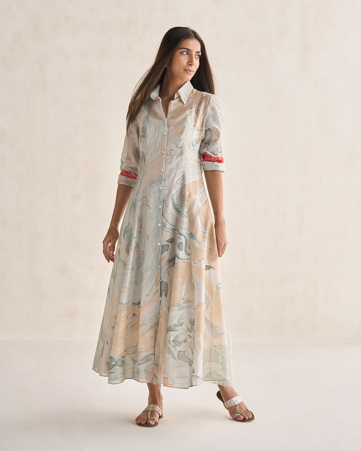 - Crafted from exquisite cotton silk adorned with a mesmerizing marbling print, it exudes a captivating charm.