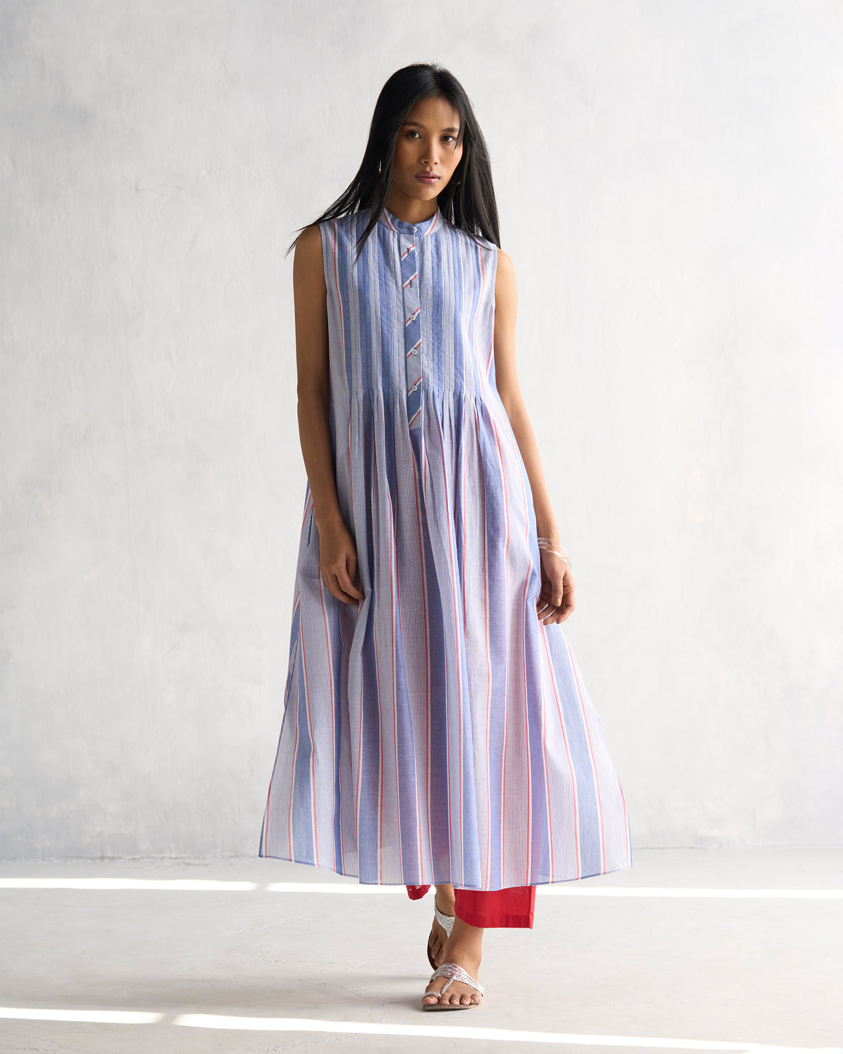 - A vibrant addition to your wardrobe, the sleeveless Summer Fun Kurta’s perfect for those sunny days and breezy evenings. Broad blue and red stripes gracefully adorn the kurta, offering a balanced contrast to the finer narrow stripes, creating a harmonious visual texture.