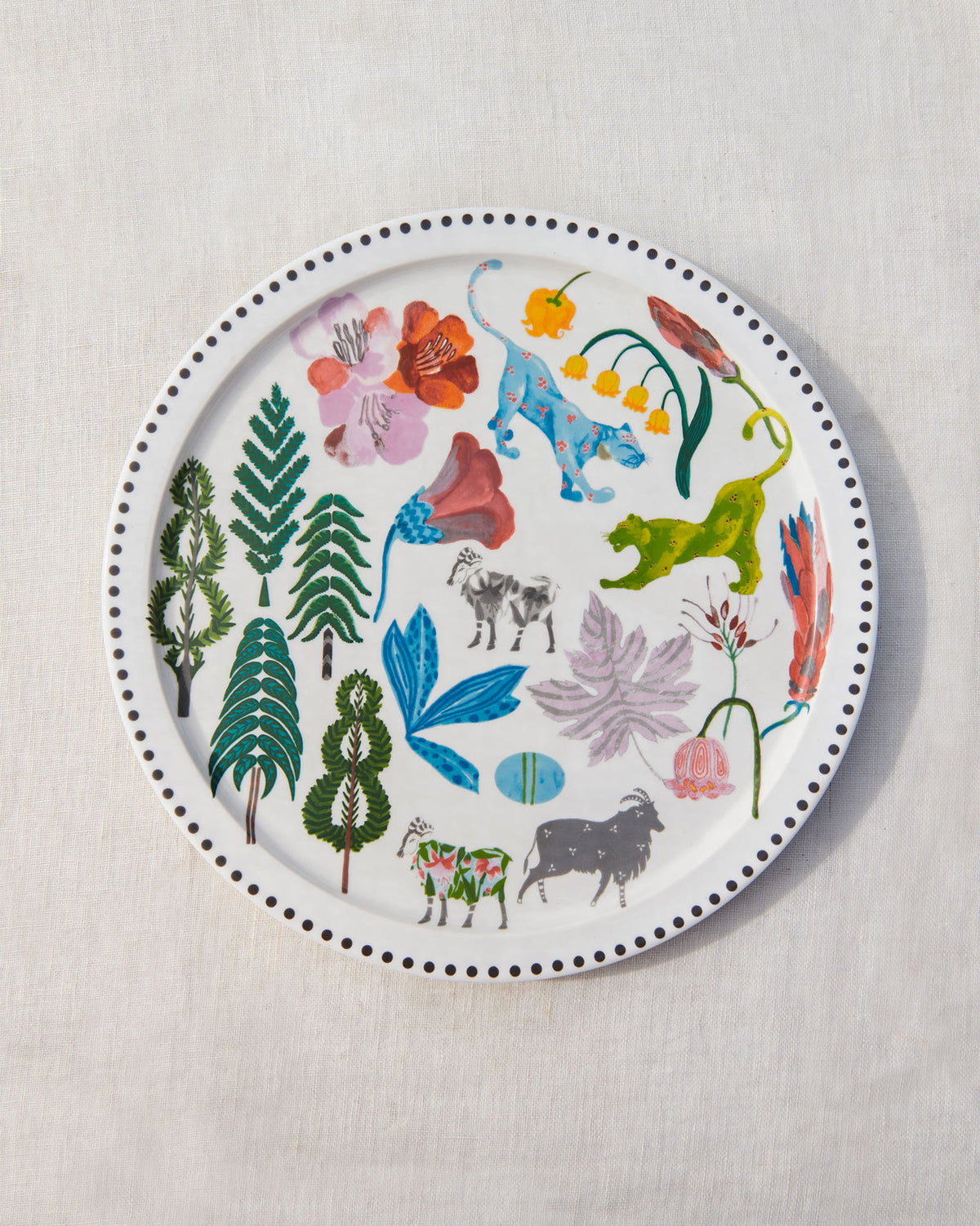 - Porcelain platter with a dotted rim, decorated with abstract motifs that are inspired by Kashmir