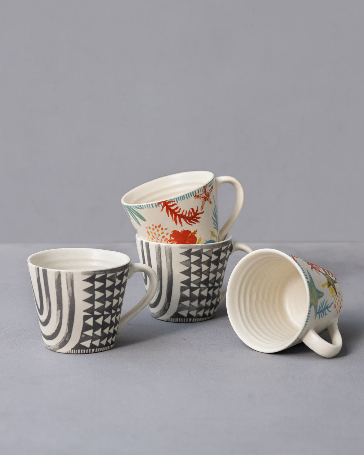 - A set of four stoneware espresso mugs featuring two distinct patterns: island-inspired foliage and graphic white-and-black geometric motifs.