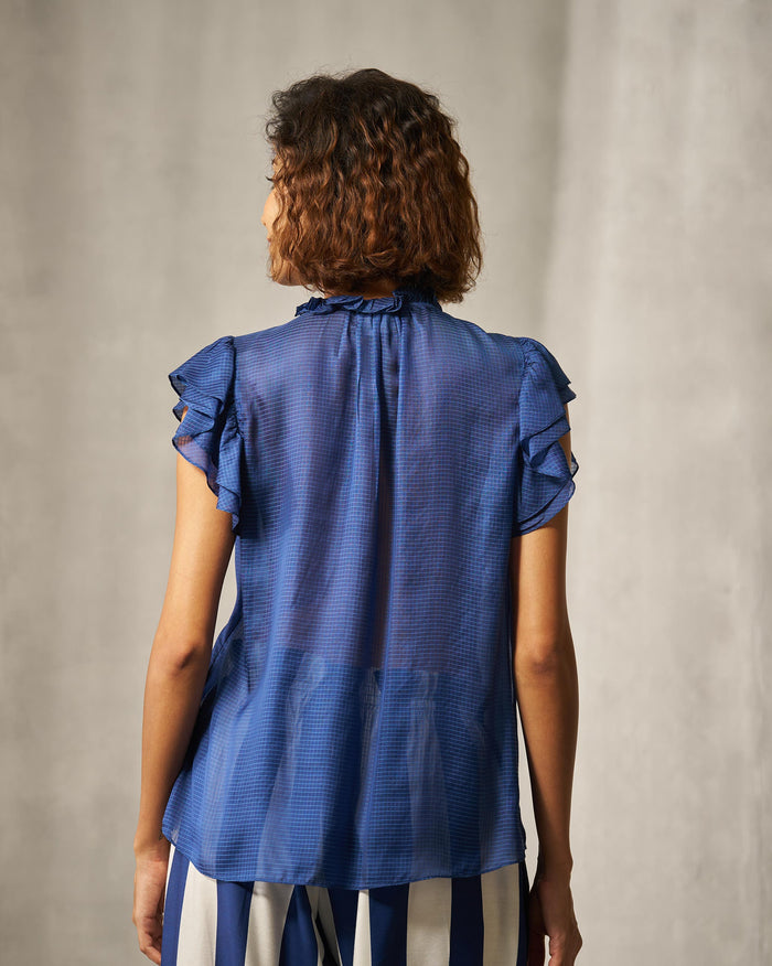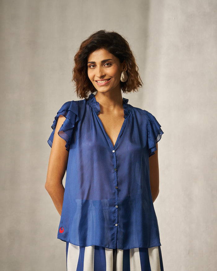 Ruffle Collar Shirt - Blue Checks
