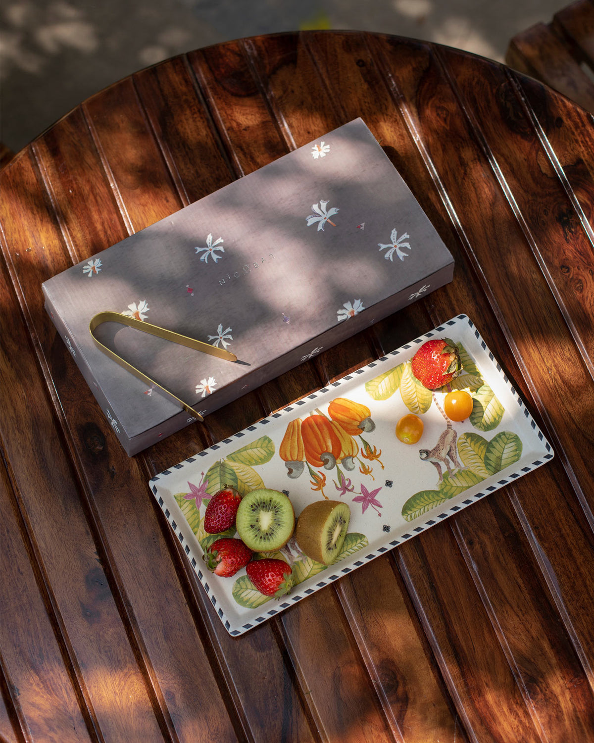 - Crafted in smooth stoneware, our cookie tray features motifs inspired by the flora and fauna found along India's vast coast, plus a pair of tongs with brass finish