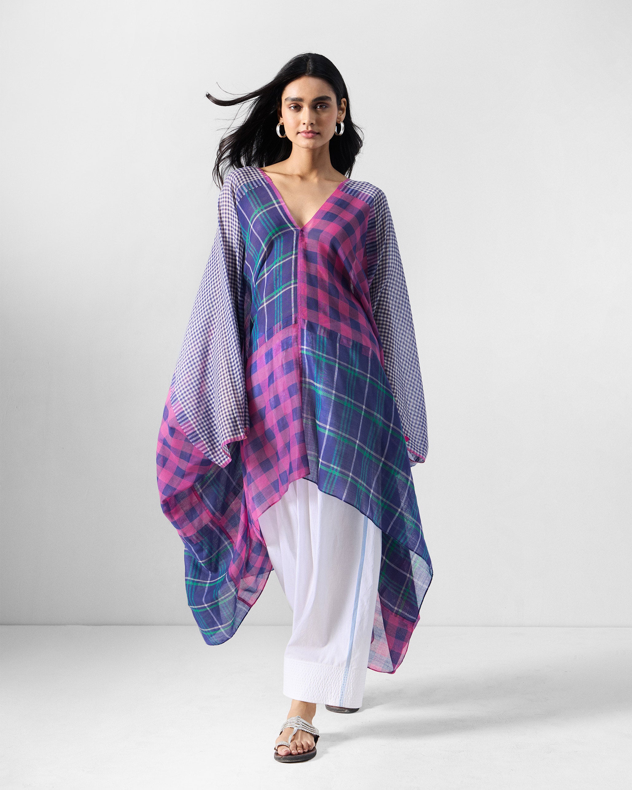 - The Draped Kaftan in multicolour checks exudes relaxed sophistication with its flowing silhouette and easy palette. This is a 0 waste garment.