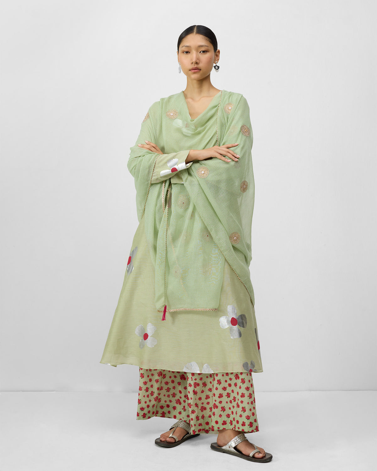 - Crafted in cotton-silk Kota, it’s embroidered all over with silver gota florals that glint softly as you move.
