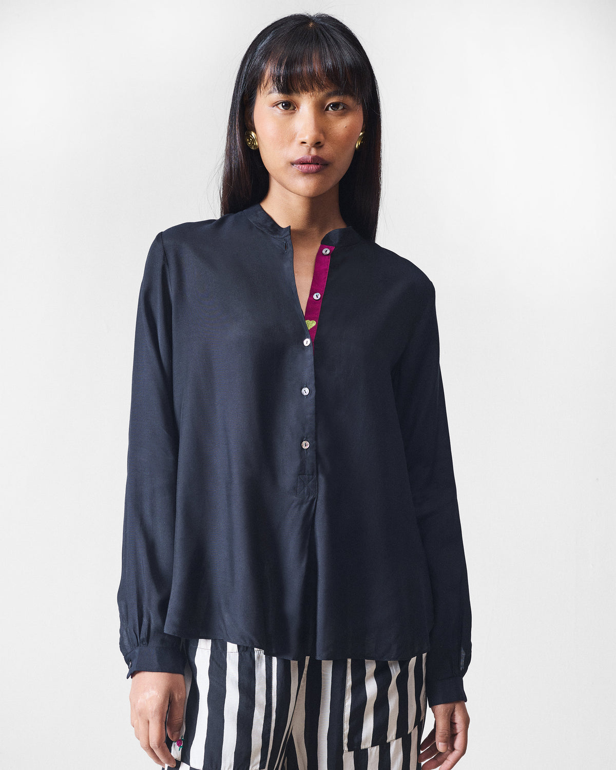 • Crafted in fluid Bemberg, it features a clean mandarin collar, a relaxed fit, and contrast detailing tucked inside the cuffs and back yoke.