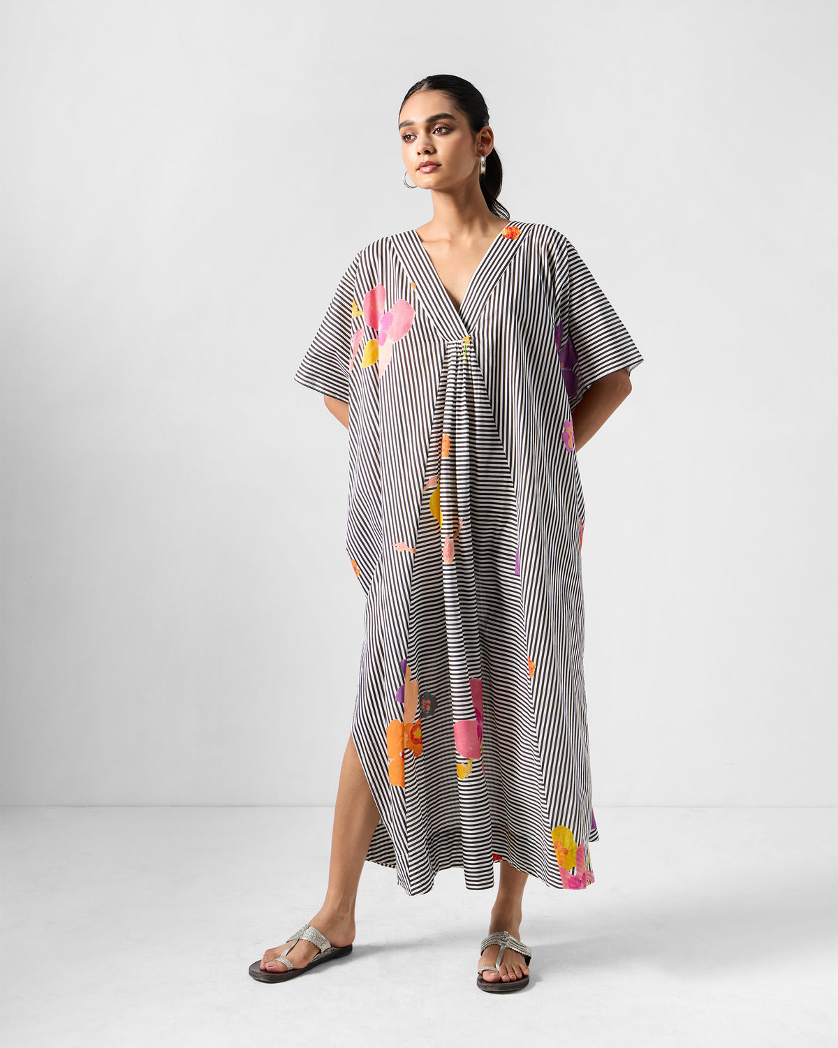 - The Noa Kaftan brings classic stripes and blooms together, created using eco-printing techniques that beautifully capture the essence of flowers offered to the Ganga.