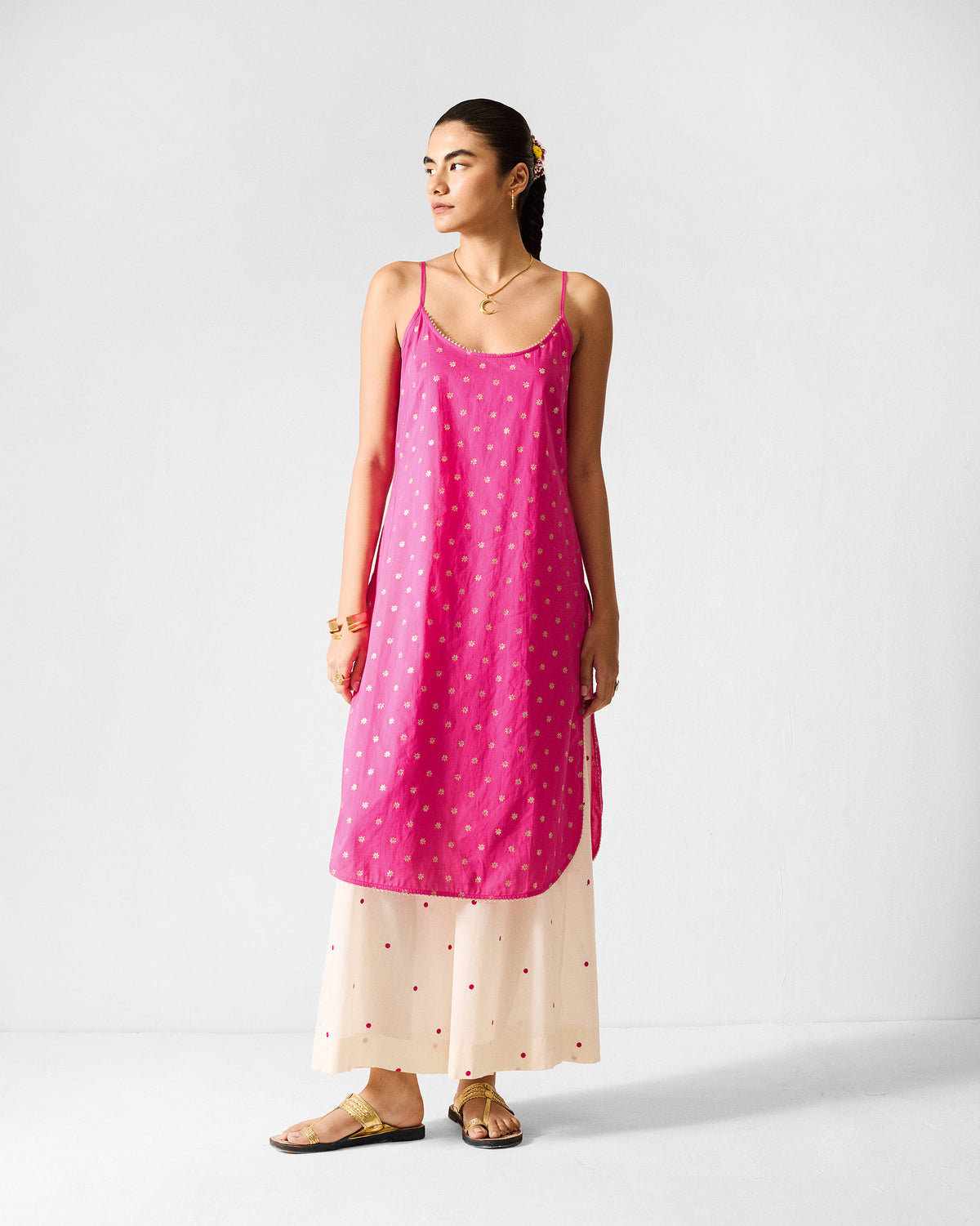 - This vintage-inspired adjustable camisole offers lightweight comfort with a delicate drape. The soft fuchsia base is adorned with tiny gold floral prints, adding a subtle shimmer that feels both timeless and elegant.