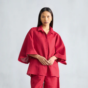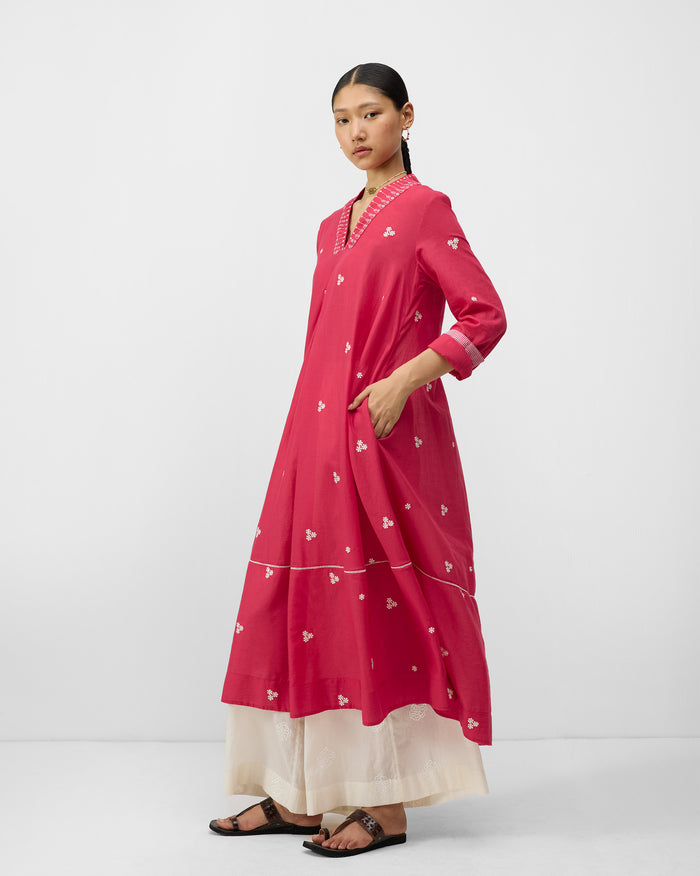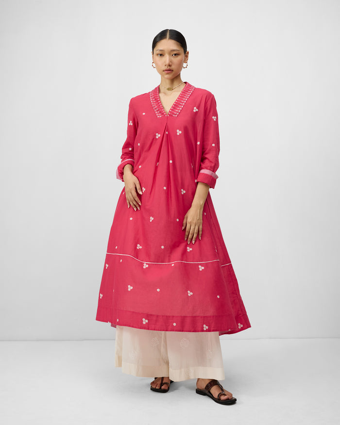 Banko V-Neck Kurta - Watermelon & Ivory Embroidered