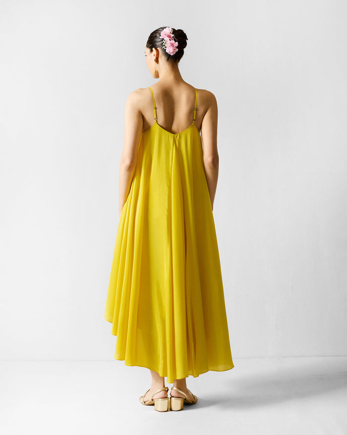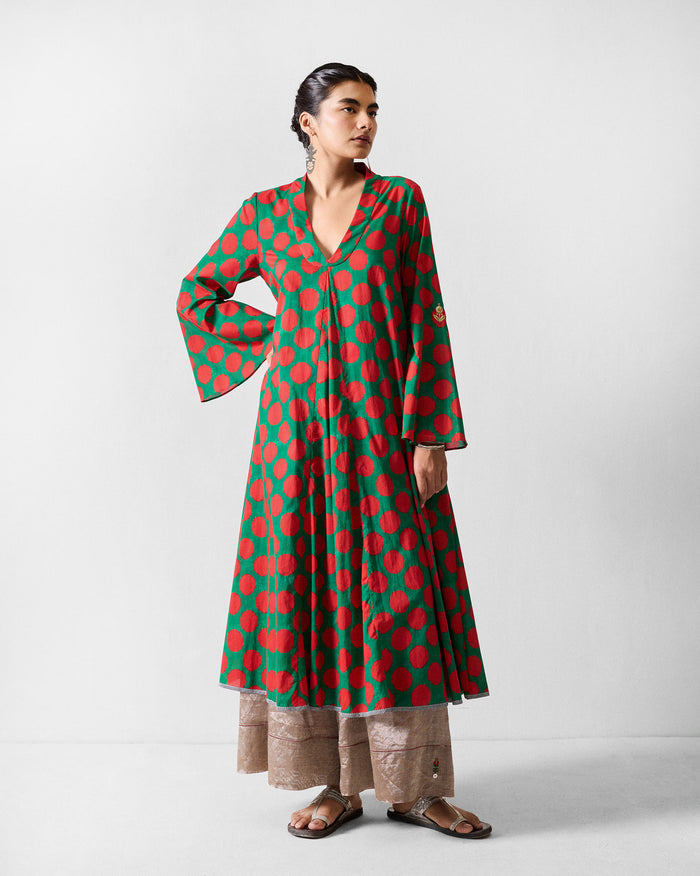 V-Neck Flared Kurta - Chartreuse & Gold Printed