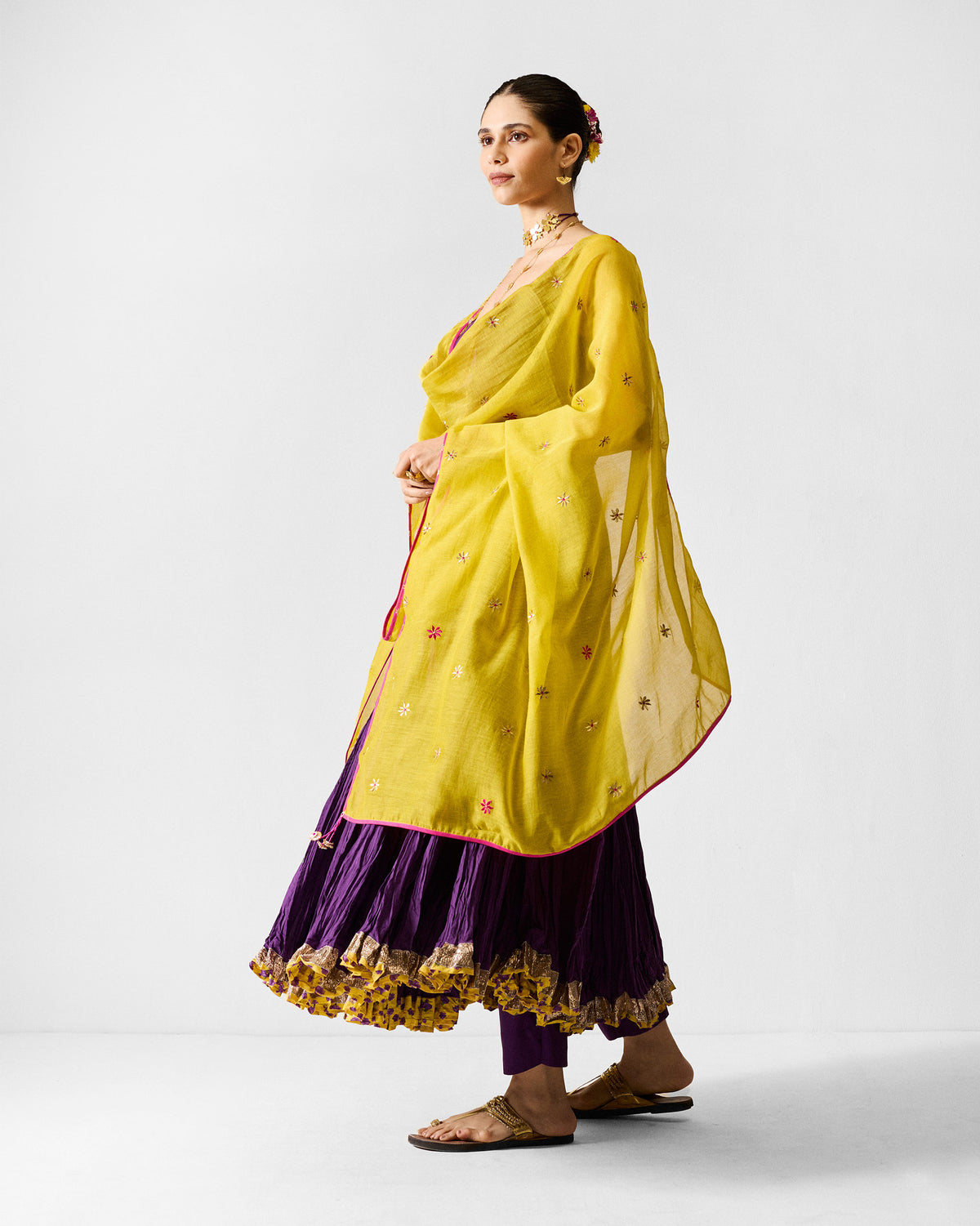- Bright, bold, and beautifully detailed, the Anaya Dupatta is crafted in airy thin chanderi, bringing lightness and grace to any look. The solid chartreuse base is adorned with all-over floral embroidery in gold and fuchsia.