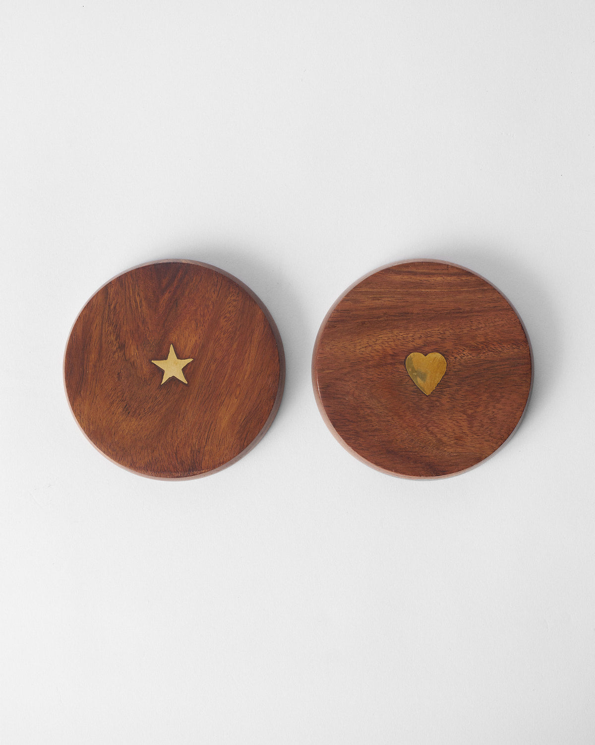 - Handcrafted in warm wood, one features a golden star and the other a golden heart, small details that make them feel special.