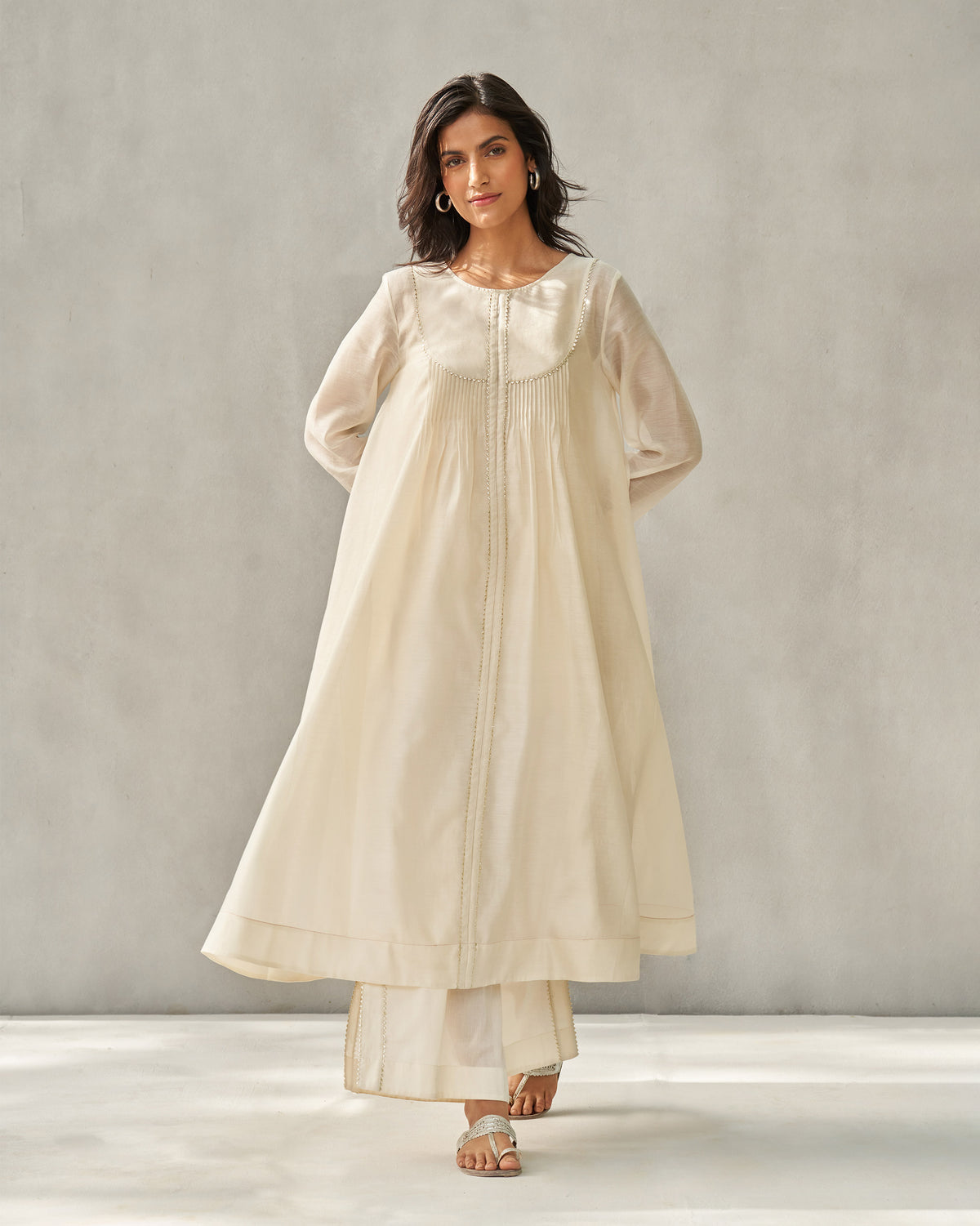 - The Ayat Kurta is the perfect pick for celebrations. A regal piece in ivory, its free-flowing silhouette and silver gota detailing make this one stand out.