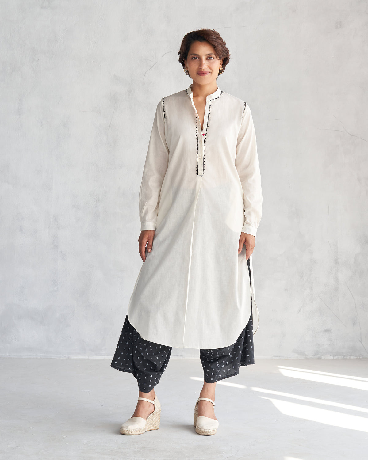 - An artfully sophisticated must-have, the Basic Long Length Kurta features a contemporary flair through its black geometric armhole edging, complemented by a delicate dot detailing along the front and back hem and cuffs, ensuring a sophisticated appeal for any occasion.