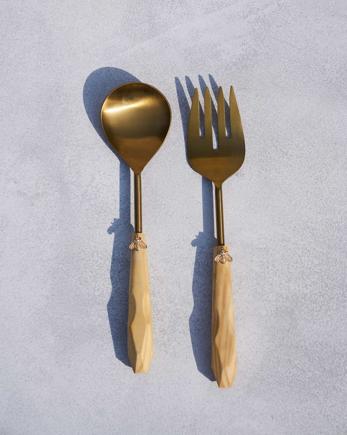 - Crafted in steel and wood (handle), this set of two servers is ideal for salads and snacks alike