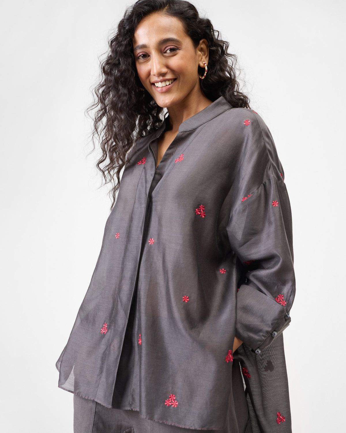 - Crafted in chanderi, the Cirrus Shirt is embroidered all over with watermelon-hued florals that lift gently off a charcoal base.