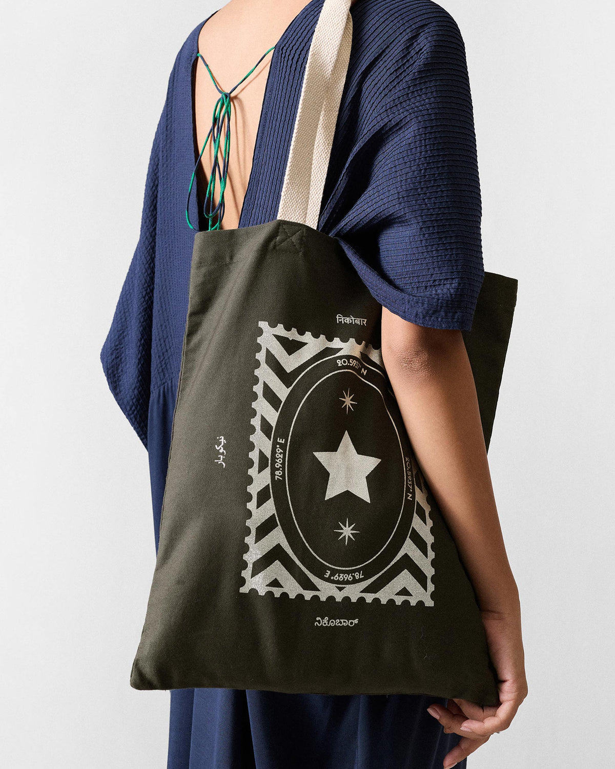 - Fnished in silver foil on charcoal for a touch of festive shine. The totes also feature our name in four Indian languages, a quiet tribute to where we’re from and how far we’ve travelled.