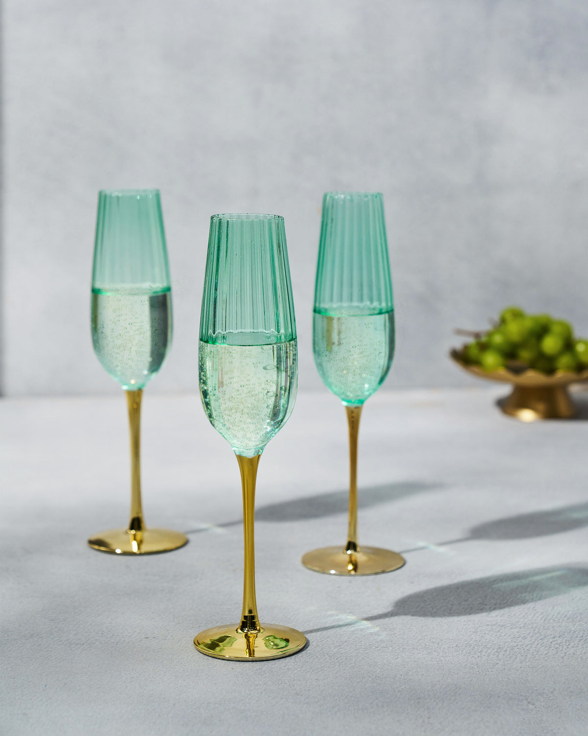- With an emerald tint, the Emerald Champagne Flutes are elegant, slender and designed to be your go-to glass for all your celebratory moments. The gilded base adds to its beautiful design.