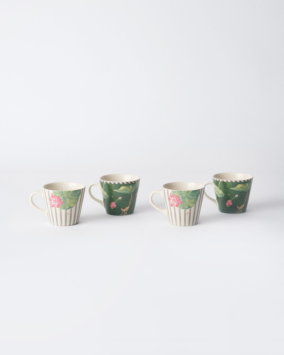 - The Float Espresso Mugs are a vibrant addition to your daily ritual, with bright greens, lush lotus blooms, and playful monkeys bringing colour and charm to every cup.