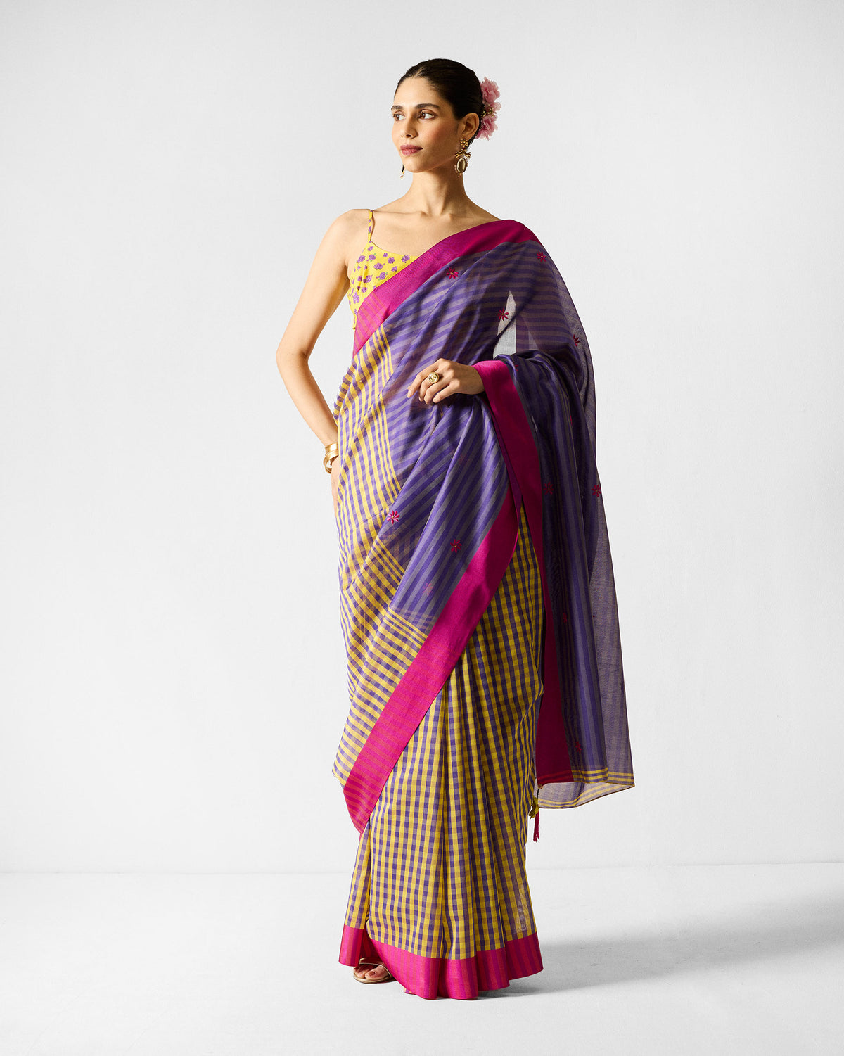 - A vibrant play of colour, the Freya Sari is made from Chanderi, a cotton-silk blend prized for its lightness and subtle sheen, this piece features a striking lime and purple check pattern that feels both playful and poised.